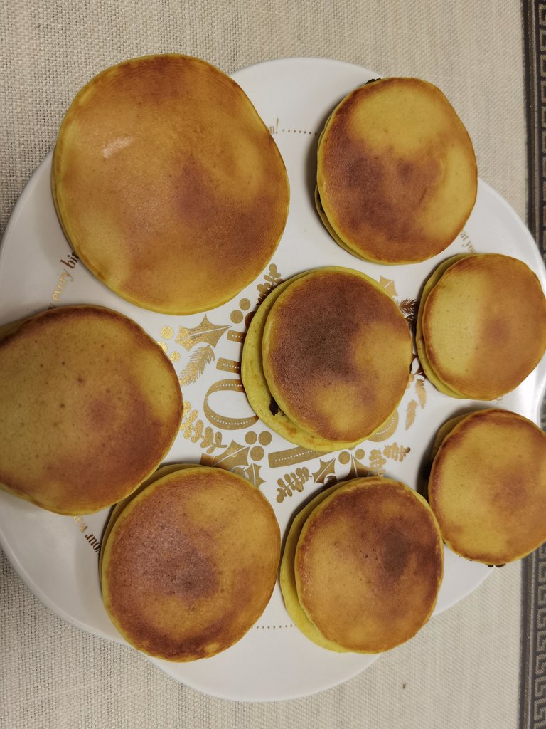 小圆饼都做好后,夹上红豆馅,两边捏一下,就成了铜锣烧了,这样做的铜锣烧真的不比买的差呢,主要的是粗粮细作,真是不错呀,实验版成功!